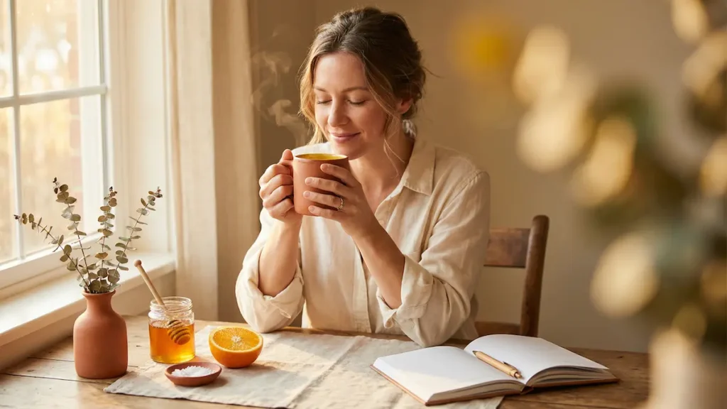 A woman enjoying a warm orange tonic made with Ray Peat Gelatin as part of a metabolic health routine.