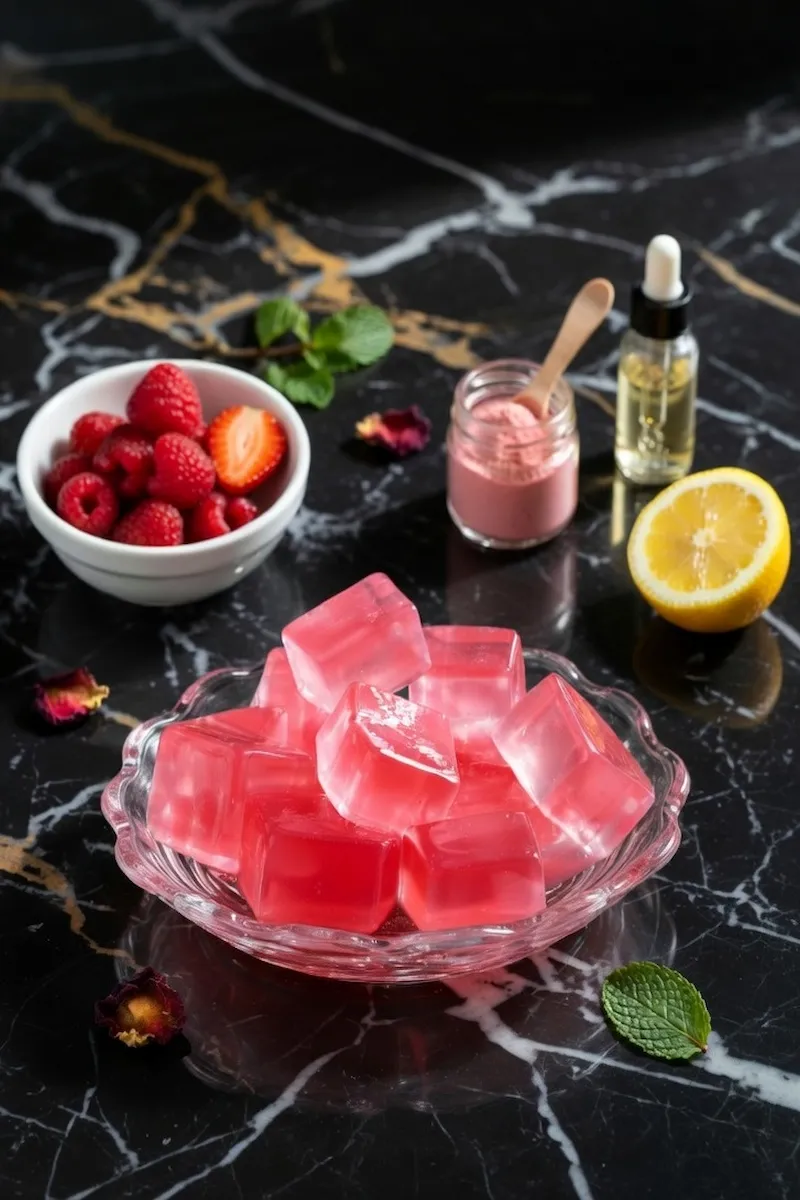 Skin elasticity and hydration. Consistent daily gelatin consumption over 8 to 12 weeks has been associated with measurable improvements in skin elasticity, hydration and collagen density in peer-reviewed dermatology research. The Vitamin C in hibiscus tea or berry juice (if used as the pink base) acts as an essential cofactor for the hydroxylation enzymes that convert dietary glycine and proline into stable collagen fibers, making the choice of pink base nutritionally relevant beyond color.