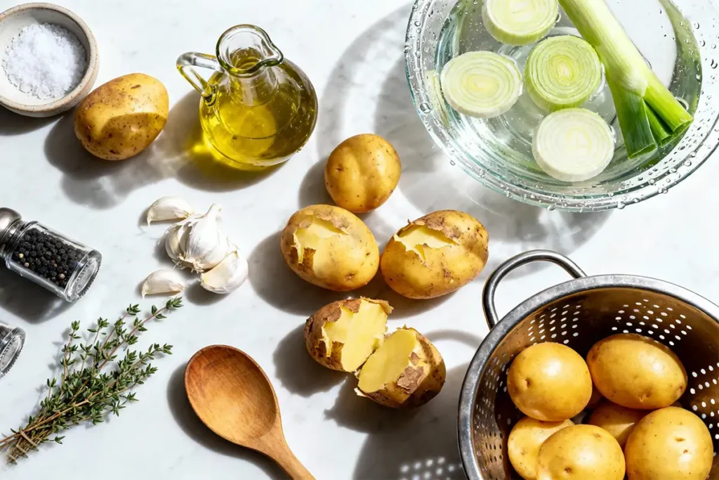 Ingredients for roasted potatoes with leeks: Yukon Gold potatoes, fresh leeks, garlic, thyme, olive oil, salt, and pepper—ready to create a flavorful side dish.