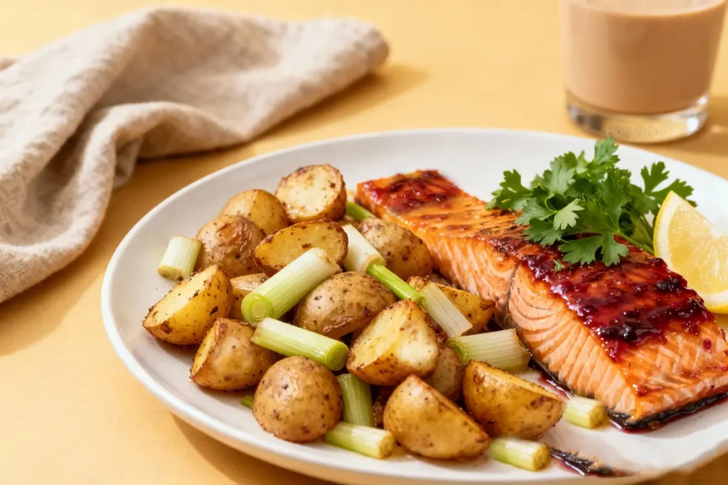 Golden roasted potatoes with caramelized leeks served alongside glazed salmon on a white plate—the perfect side dish for any main course.
