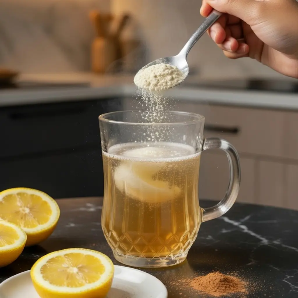 Pour 1/4 cup of cold filtered water into a mug or small bowl. Sprinkle the tablespoon of gelatin powder evenly across the entire surface of the cold water in a thin uniform layer. Do not stir, do not pile it in one spot. Let it sit completely undisturbed for 2 to 3 minutes. You will see the gelatin absorb the water and swell into a soft translucent spongy mass. This is the blooming process and it is the most important technical step in the recipe. Gelatin that skips this step forms irreversible clumps when hot water is added, resulting in a grainy, unpleasant texture that most people refuse to drink a second time.